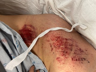The answer to that question, I will likely never know, but what I do know is a nice dude on a dirt bike found me unconscious on the road and called 911. Apparently he woke me up and we had a conversation (I have zero recollection of) and he had me call my husband (which I also have no recollection of). I know I hit the ground HARD on my left side, bounced on my head onto my right side and skidded to a halt on my right shoulder and chin. Oh, and I snapped my handlebar on the right side and injured my right wrist. This I’ve put together based on the damage to my body and bike. Needless to say, it was an intense shower of scrubbing gravel out of all limbs that night!